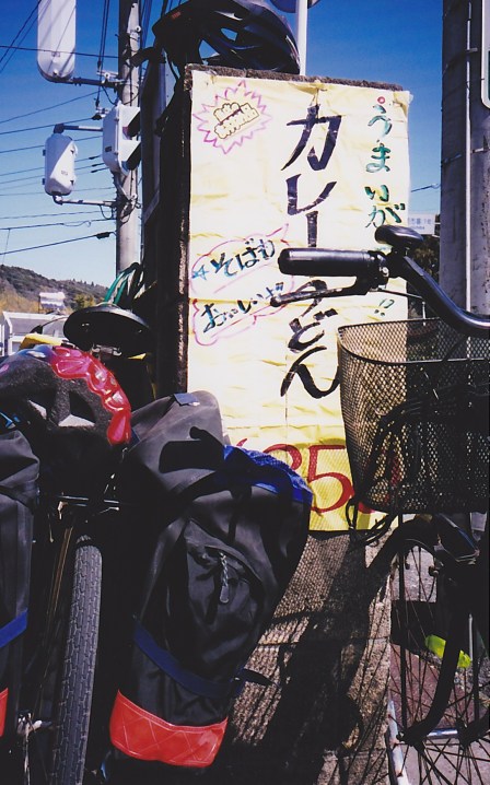 Here are our two steeds standing near where we had lunch, possibly. The sign screams ‘Curry Udon!’ and ‘Delicious Soba!’ I’m sure it was…