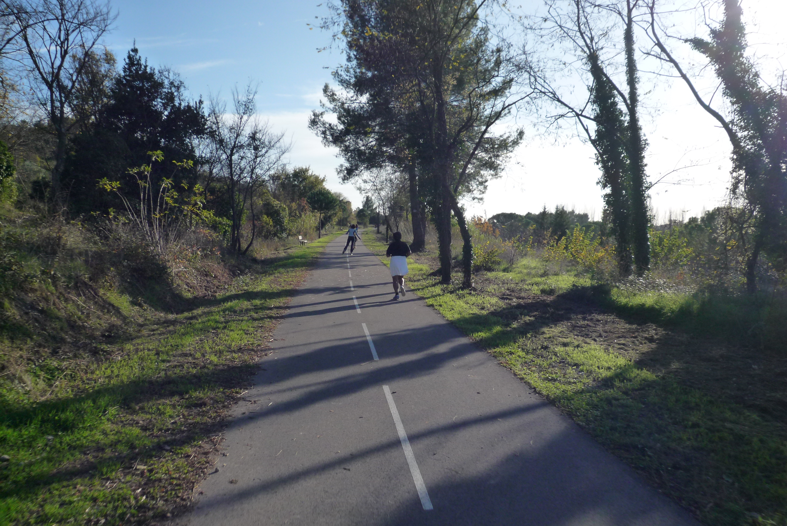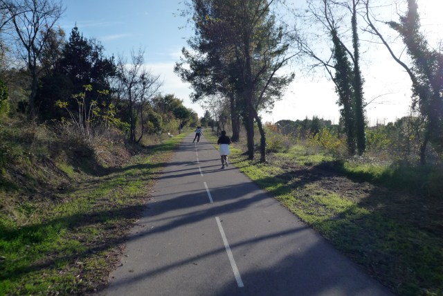 The path was surprisingly well populated, especially near Sommieres. This pictures handily shows the multi-purpose nature of these things, with bladers, runners and the (unseen in this photo but there) ever-unpredictable kids on bikes (what prevents kids from travelling in a straight line anyhow?).