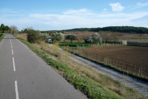Firstly, thanks to Peter from the Languedoc Page for reminding me that I had to get off my butt and check this thing out. I’d been sort of meaning to ride this 20-km long cycling path for over a year, but since it starts over 35km from home I guess I just never had the juice to go out and do it. But thanks to 19 degree weather and a busted PC that kept me inside all weekend (yes, it’s a Windows…need you ask?), I had lots of aggression to get out of my system. So, after lunch today I packed up a pannier and took off.