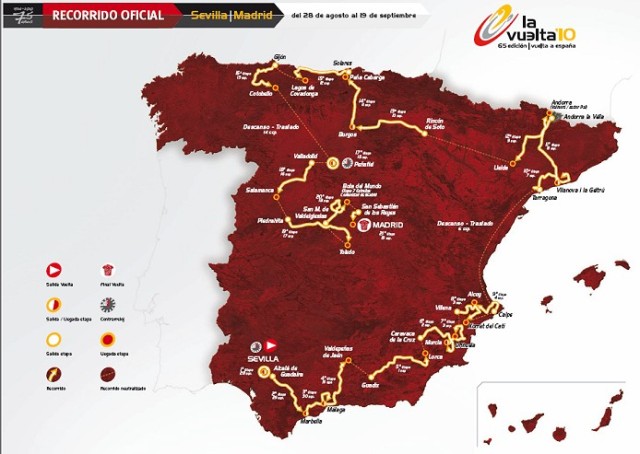 Last up is the Vuelta a Espana, held every year in September. The Spanish, like at least the French (and I assume the Italians), are nuts about cycling, and most of the great riders will win the Vuelta once or twice at least. The best rider in the world at the moment, Alberto Contador, is no exception, having won it in 2008. This is the route this year.