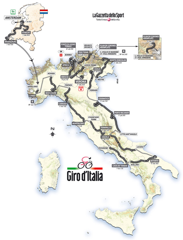 First up, since it is the first of the year – The Giro d’Italia. The Giro is a 3-week race (like the others) that began 101 years ago in 1909. It runs in May and is often looked upon as an excellent warm-up for the Tour de France for the big-name riders. Here’s this year’s route, surprisingly starting in Amsterdam.