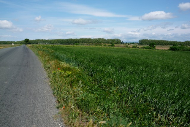 Outside of the village I hit the wind full on, but also the openness of this area. I suppose the two go hand in hand. I met a French guy on my ride from Adelaide to Darwin that had totally lost the plot after a few weeks of riding the Stuart Hwy the ‘wrong way’. He just couldn’t understand why the wind kept blowing the same direction every single day he got up to ride. But I am digressing. Here’s the flatness north of Narbonne. Notice the wheat (I think) on the right – something you would never see around my neck of the woods. Nice for a change.