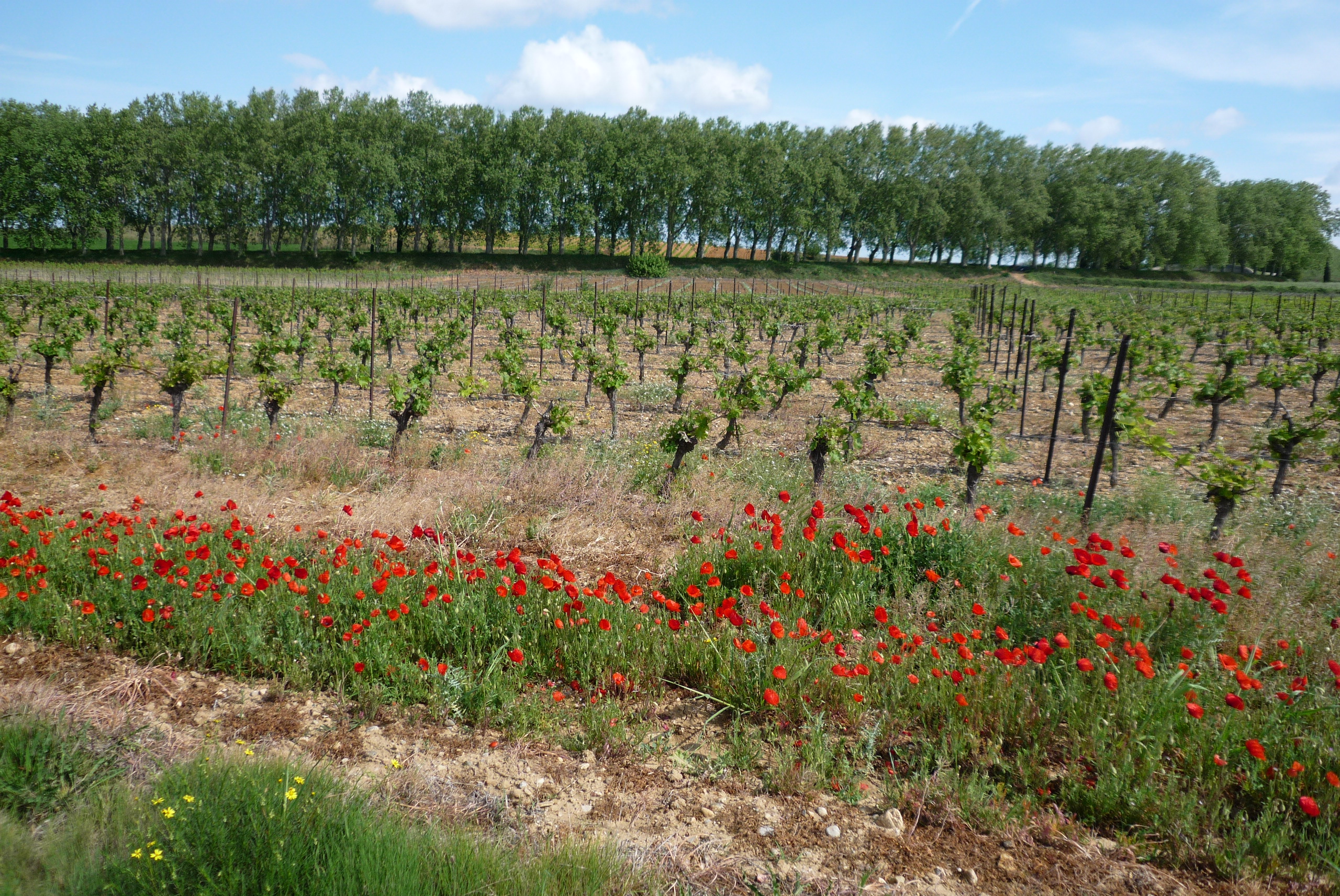 And while I was taking this shot I saw that line of trees in the distance and realized what I had forgotten from researching this area before – the Canal du Midi runs through it. Here it is closer up, with some lovely wild poppies to add color.