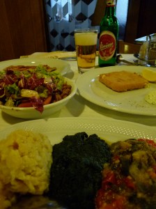 And this is what we ended up with: a giant plate of veggies for Shoko, deep fried cheese, chicken of course, and my Union pivo. Although is doesn’t look that spectacular in this light, it was probably our most satisfying meal of the whole trip. I mean, how many times do you get to mimic your food before eating??