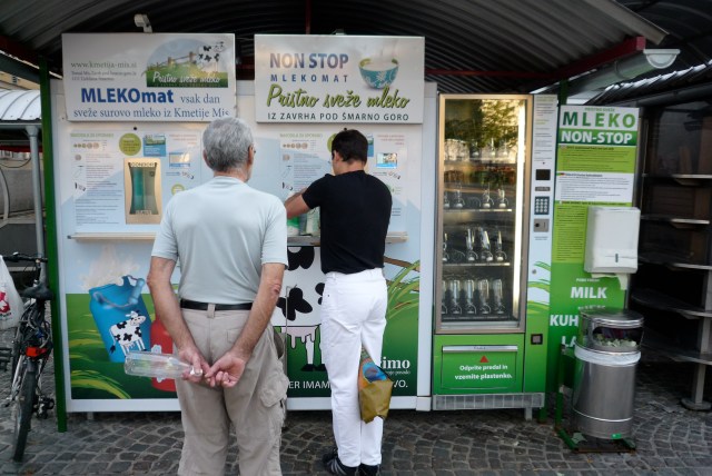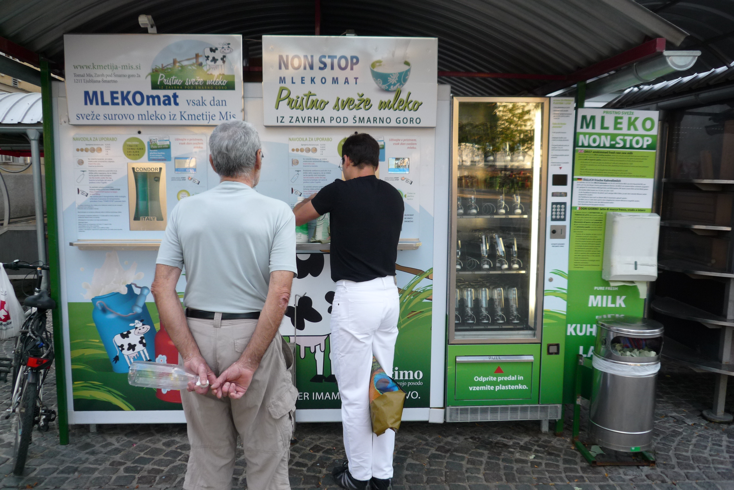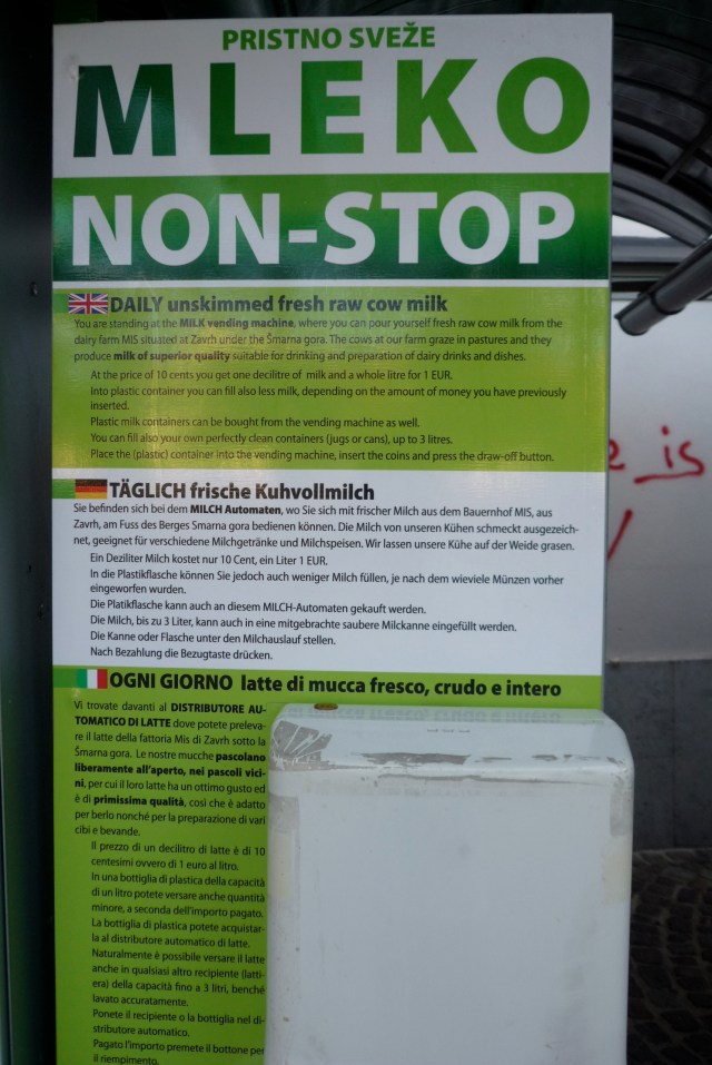 Turns out it is a milk machine (MLEKO, possibly the only word in Slovenian that I could connect to English). The lady in front of these guys told us that it is refilled at least daily (you can read exactly when on a digital readout) and the milk comes from farms near the city. You just rock up with your empty bottle (like the man in the foreground) and fill ‘er up! If you don’t have a bottle, you can get the same stuff in bottles from the machine next door. Here’s a close-up of the introduction/instructions.