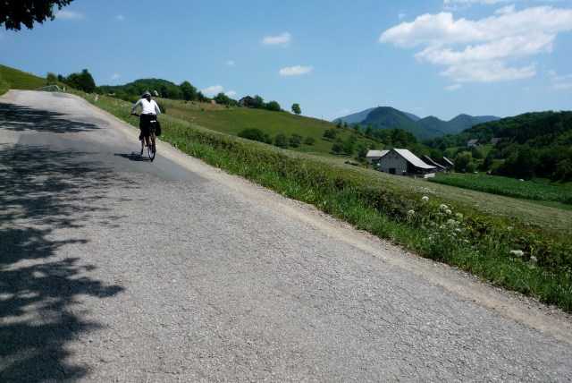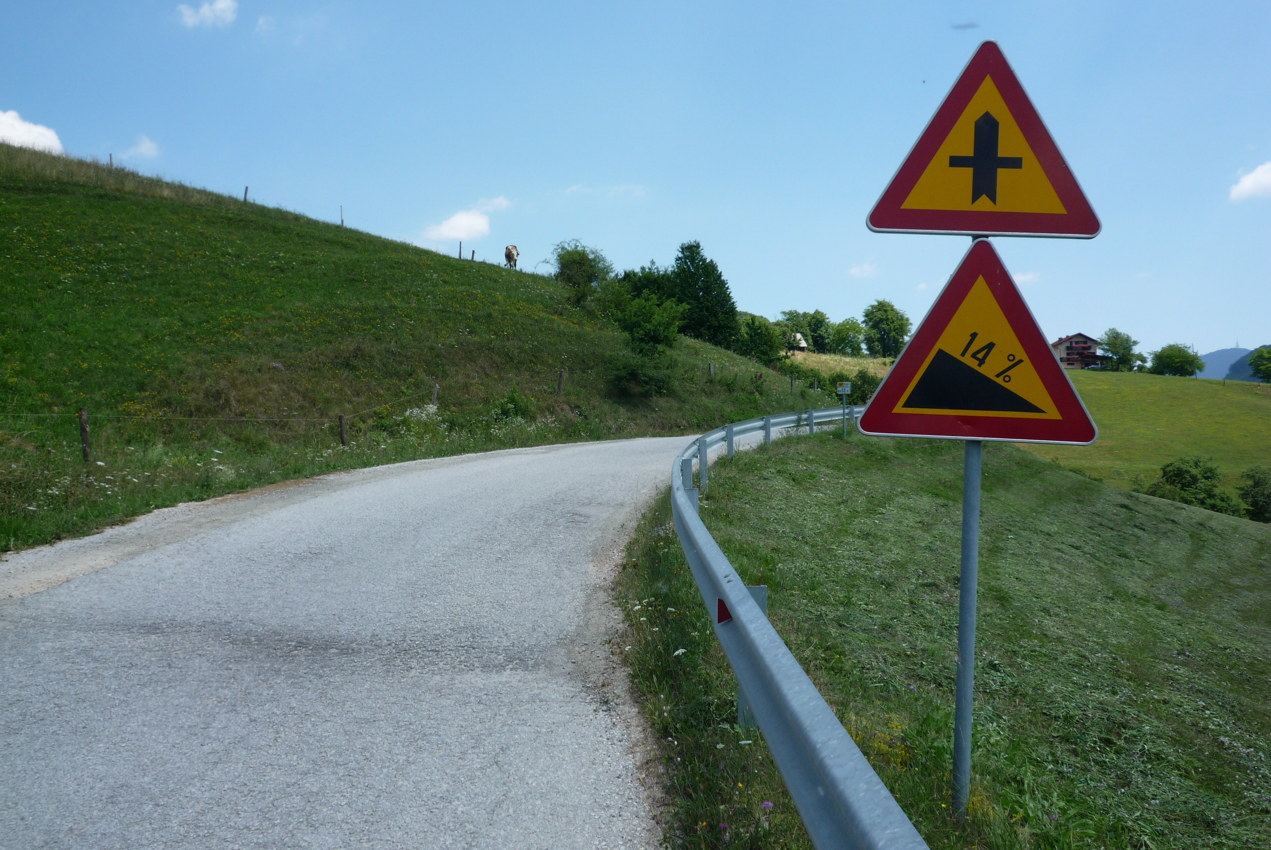 Today was unintentionally hilly. You see, the incredibly big map of Slovenia I bought before leaving France, being very detailed when it came to including every donkey track in the country, failed completely when it came to telling you how steep a road was. If you are a cyclist you’ll know that this bit of knowledge is pretty valuable. Michelin maps have those great little arrows, telling you how painful the climb will be. Our map – nada.
