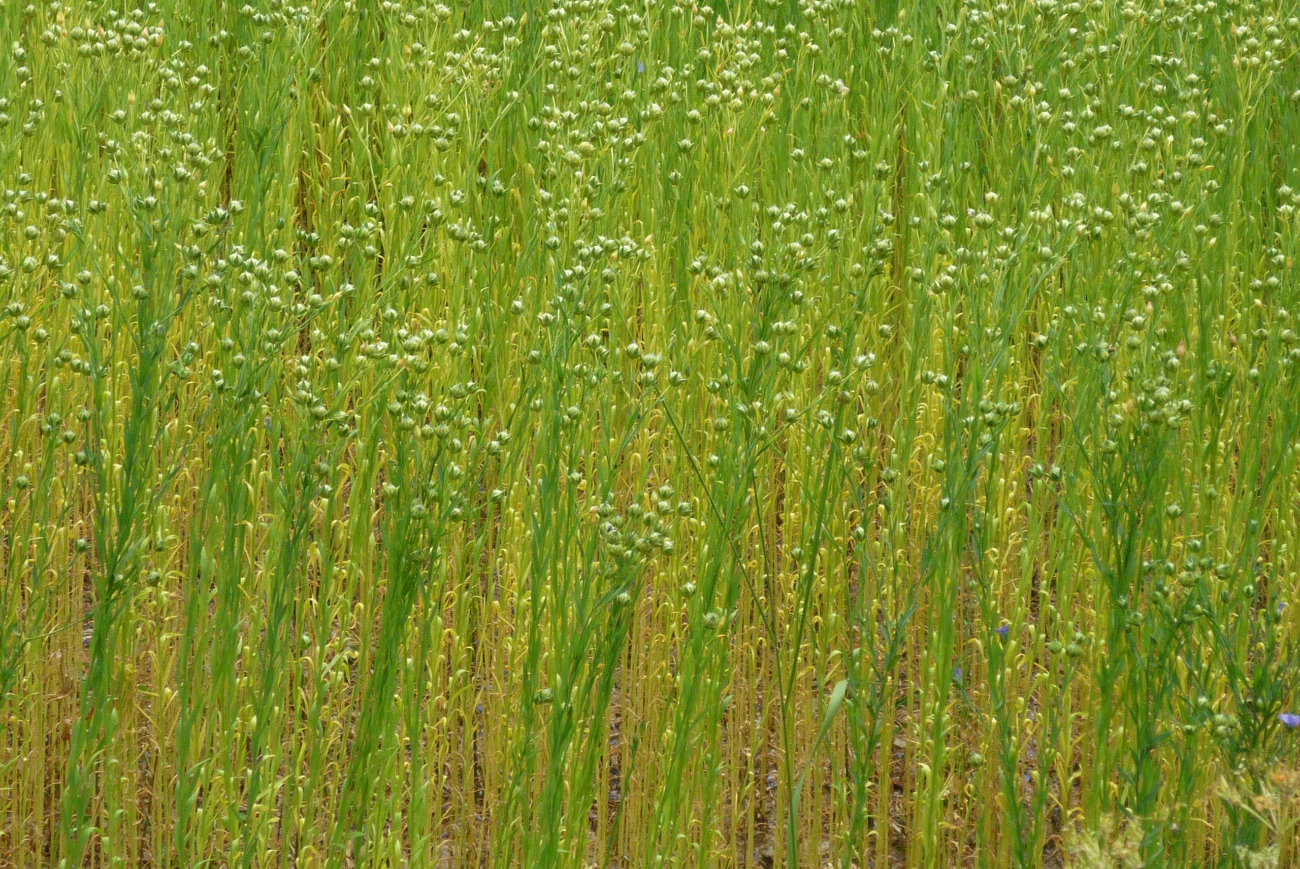 The middle crop looks like it is flax, either for linseed or for the production of linen (given the number of flower heads I would hazard a guess at linseed). But it is at a pretty strange state for early September. In Britain and France it was long since either harvested or has been laid to dry. This must be a second crop.