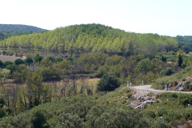 Otherwise, the road is similar. It rises to the top of the mountain and rolls over the scrubby top, till it descends to the Uzes side. There is one lovely little valley in the middle with two B&Bs that look very inviting indeed. Here is the little forest of one of them.