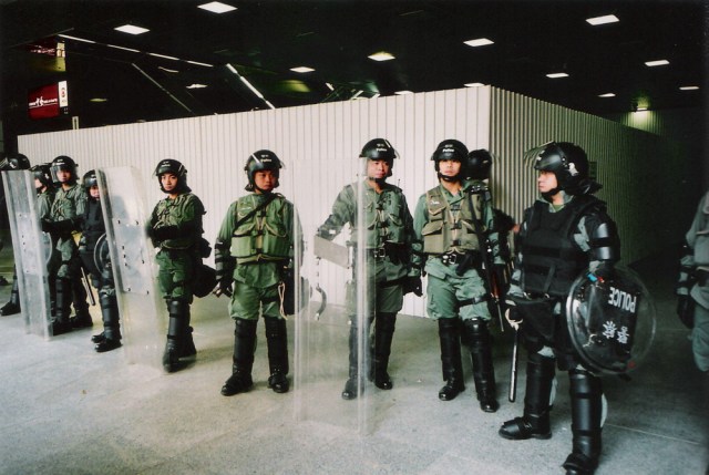 But I must say, and I really hate to say it, the most important thing that happened to us in Hong Kong was being tear-gassed. We were essentially in the wrong place at the wrong time (we were there for 4 hours, so odds were we would hit the “wrong time”) as witnesses to an amazing spectacle. A huge contingent of South Korean farmers had deaked out the police by not following the main parade route (that stayed a safe distance from the Convention Center) and basically out-flanked them to get within a few meters of the place. Shoko and I saw the police in riot gear and stuck around out of curiosity.
