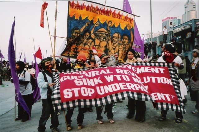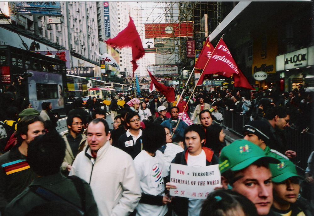 Oh yeah, I do remember this. This year saw us starting to get involved in “important matters” and we have been doing a lot of reading about animal cruelty, poverty, fair trade, etc. I am almost a vegetarian now. Fish is the last holdout. Shoko already was, so veggies are all I get for dinner anyway! The reading we did led us from one topic to another, as these things tend to do, and sometime in November I get this email from Shoko saying that wouldn’t it be cool to go to Hong Kong in December. I’d been there 4 times already, so wasn’t really sure what would be so great about it, but the next email enlightened me. The 6th WTO Ministerial would be held there and the decisions made (or not made) would directly relate to many of the issues we were getting interested in, particularly trade and poverty. She wanted to go and join the protests and marches planned around the event.