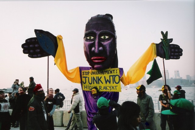 …we dove into the multitude of events that were happening around the meetings themselves. We basically just walked from tent to tent, stall to stall, listening to the stories of people in (mainly south) Asia who feel that the policies of the WTO and the rich countries that rule it, are destroying their livelihoods, impoverishing their land, and starving them in the process.