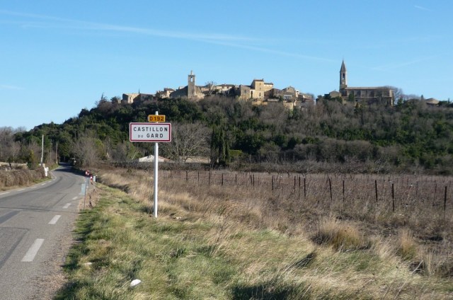 My goal today was Castillon du Gard, a village I have seen a few times from the motorcycle and warrants one star on my Michelin map. It was a pretty village of cobbled streets and obvious antiquity, along with a super panoramic view of the area. Here’s my first glimpse of it.