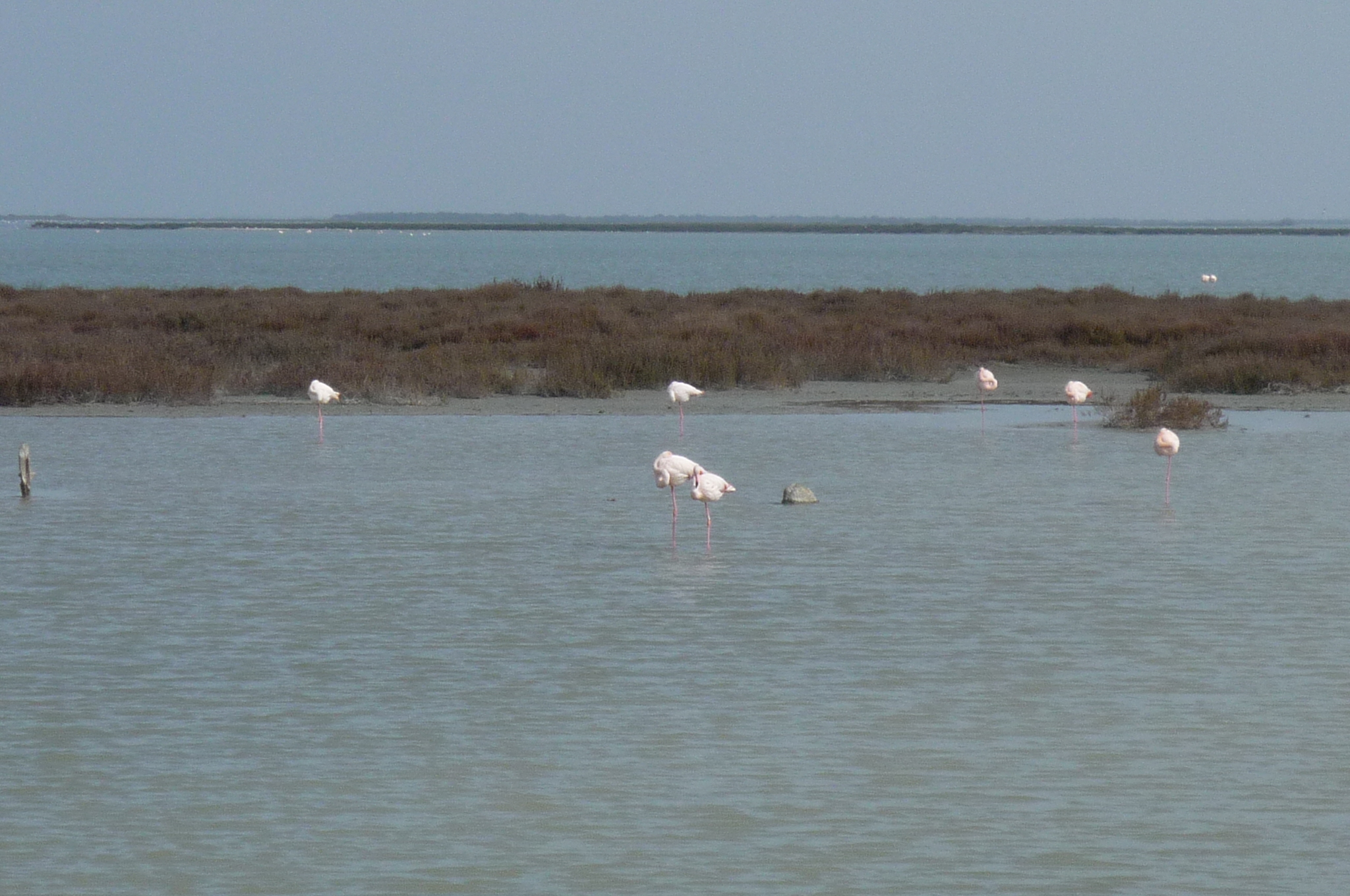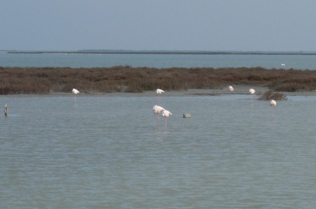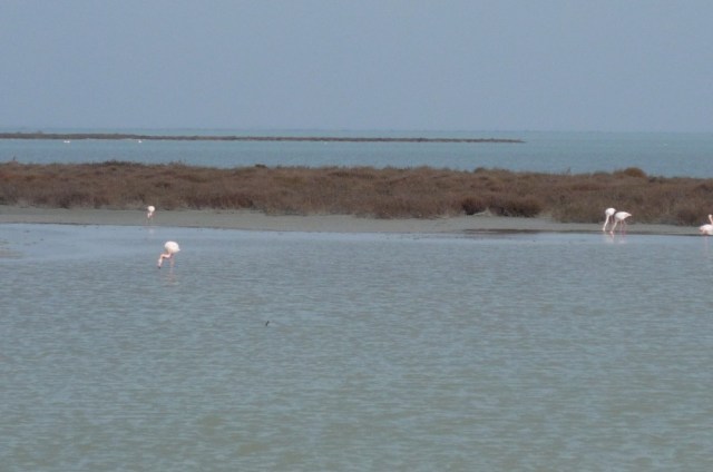 The Camargue is also a nature park and is home to untold numbers of migratory birds. These are the elusive (at least to my inadequate zoom lens) pink flamingoes.