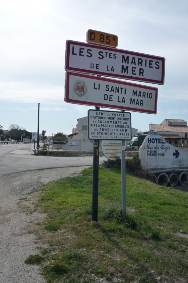 This is the town sign of Saintes Maries, with a warning underneath for gens du voyage , (traveling people) one of the many names given to Gypsies. Others incude Gitan and Gitano (in Spain) and these 3 have their origins in ‘Egyptian’ (or the local equivalent), where people thought these ‘travelers’ came from. Tsigane is possibly the name they give themselves (but not in all countries) and Roma is what Wikipedia has them down as (many in France at least come from Romania it seems, since that’s where France keeps flying them back to). So the sign is telling these folks that parking is strictly prohibited in the town limits, but there is an area outside where they can stop for 48 hours.