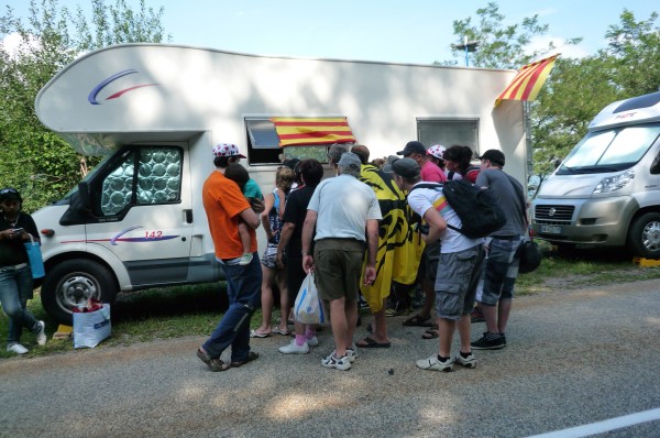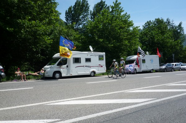 Actually learning from past mistakes, we got up before the sun and started our way down the A9 towards the mountains, reaching the bottom of the climb just before noon, or about 5 hours before the riders. Even then the road up was already closed, so we parked on the nationale and had some lunch on the road. This road closed shortly after and there was already a pretty festive atmosphere, with the ubiquitous camper-van crowd, along with their environmentally-friendly colleagues, cyclists.