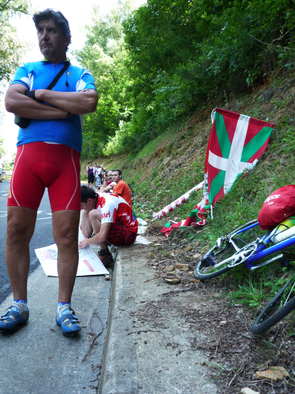 After 5 km and several hundred meters of positive elevation gain (we settled at 1000m) we found our spot on a wide left-hander, with plenty of view on both sides, not to mention a decently evil gradient. This is NOT a crotch shot, even though it came out that way. I was trying to get the Basque flag.