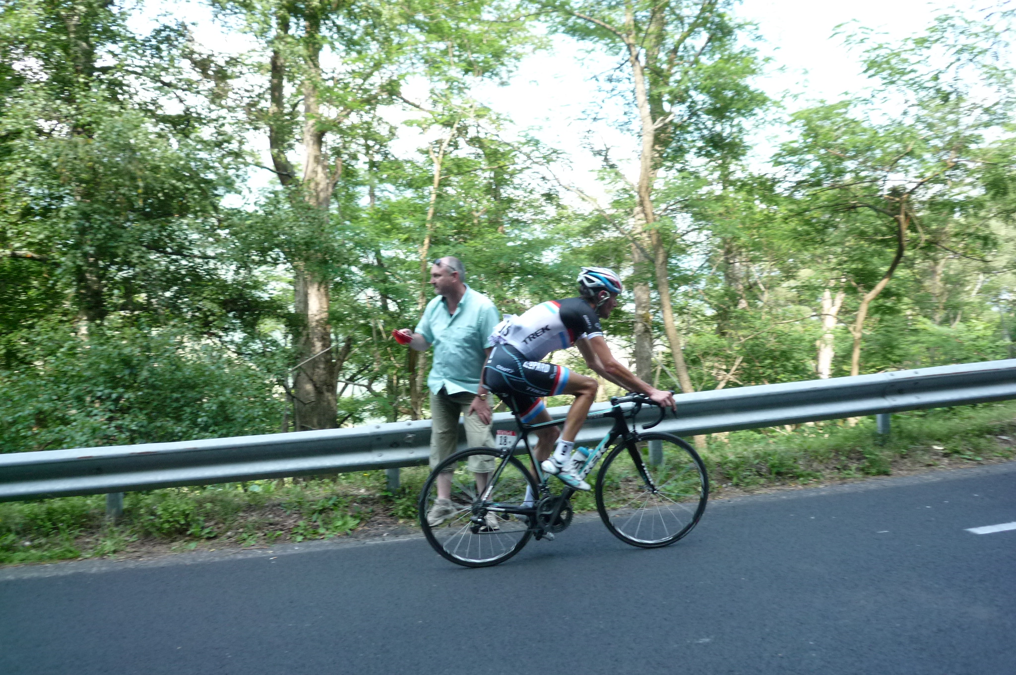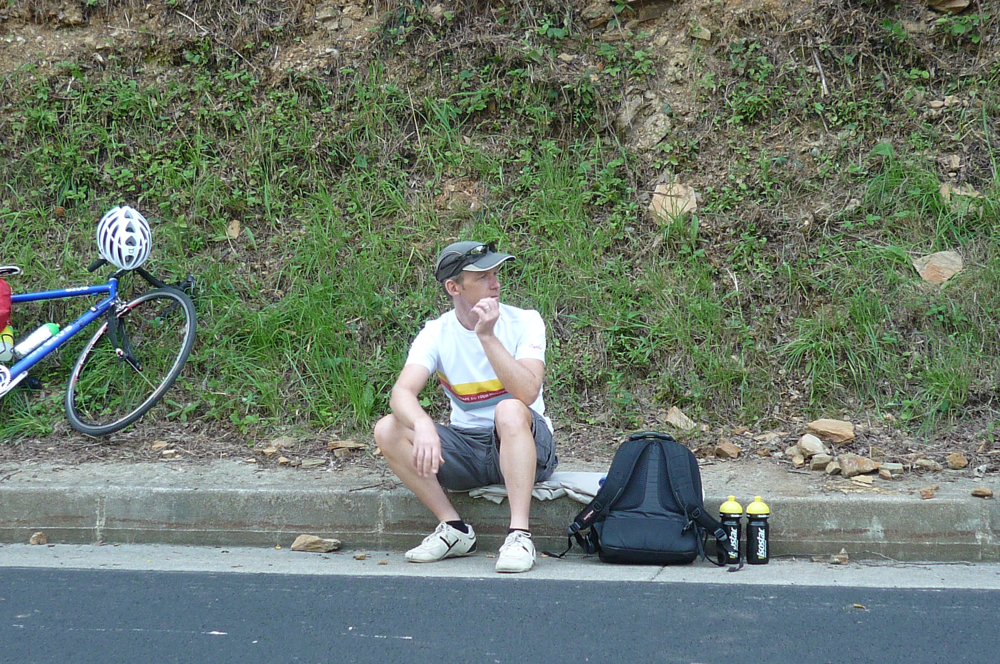 After feeding ourselves we started the long hike up the road. The climb is nearly 16 km long and I wanted to get up far enough so that the peloton would be good and truly blasted by the time they reached us. This plan, too, surprisingly worked.