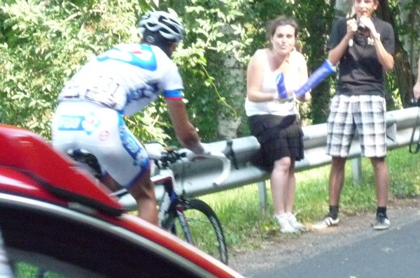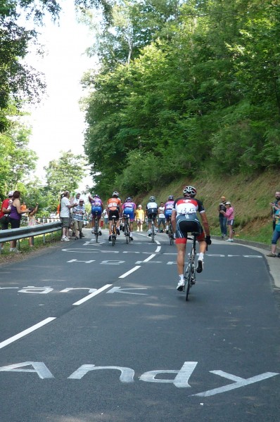 Many different groups came by, including what I assume is The Bus, a peloton that is formed at the back, with an agreement to roll slowly uphill. Then, at the very, very back (I later heard from Rob that he made the time limit by minutes), was Cav, surrounded by 3 teammates to help him up the mountain.
