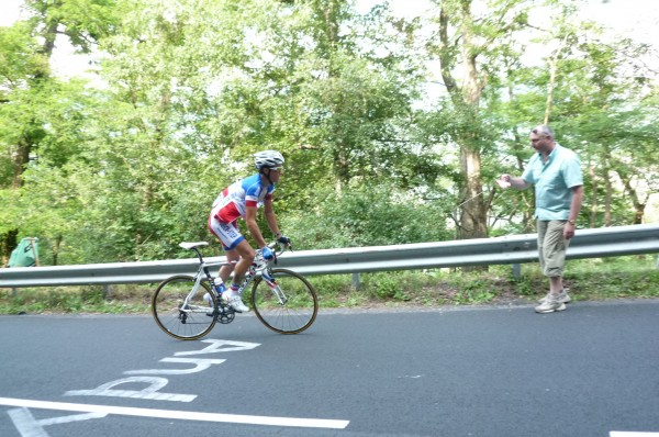 After the endless caravan ended there was a strange lull for an hour or so. Finally we heard the familiar sound of helicopters inching closer, then the first rider blasted past. This is Sandy Casar, in an ill-fated attack that was eaten up shortly after he passed us.
