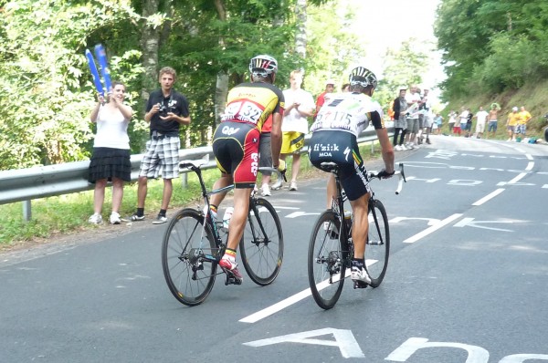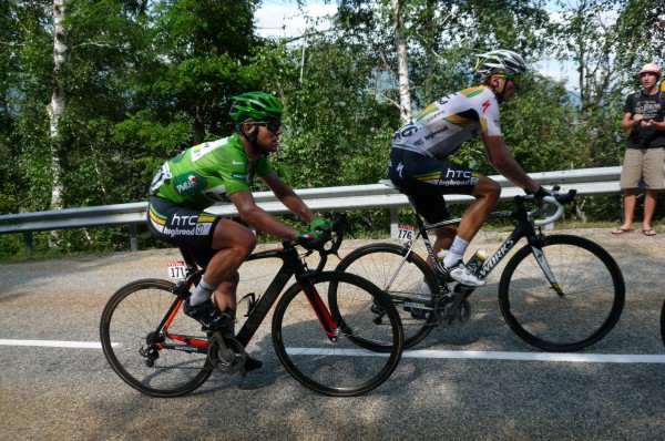 It was really interesting to see the rest of the riders spread out along the route. Many, not concerned about time at all (other than making the day’s limit), were just cruising up the hill. Here are Belgian champ Gilbert and HTC’s Tony Martin, chatting it up.