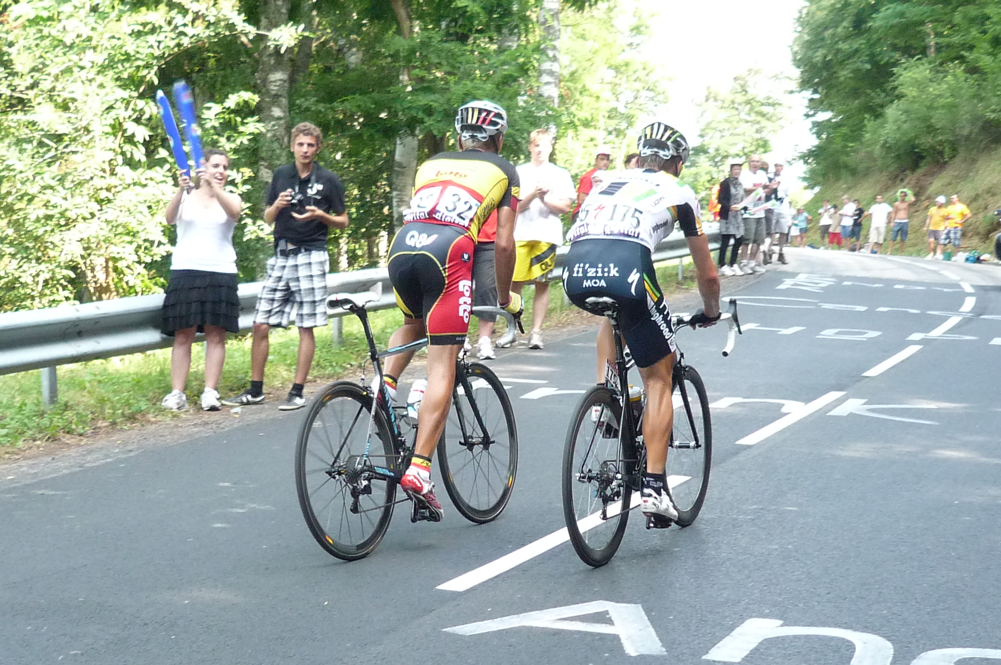 But the big boys were not too far back and when they hit our turn they were lined up like the General Classification list, nearly: Andy, Contador, Evans, Fränk, Basso and Voeckler. Here is Andy and Alberto. This is right as Andy put in his first attack of the day, by the way.