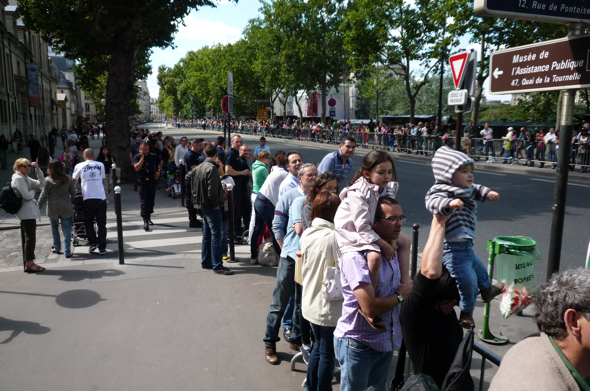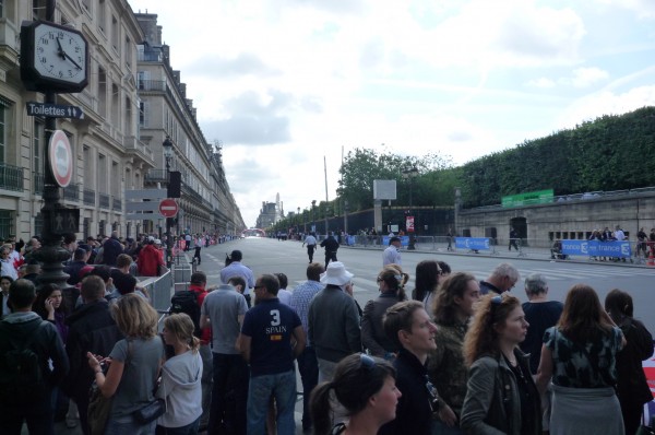 It’s not as insane as it seems, actually, since this spot (and lots others) would allow these fans to see the riders at least 8 times (or possibly 9…clear it up for me, if you know the answer). You see, the last stage of the Tour, apart from being nearly completely ceremonial, involves 8 loops around central Paris, on a route designed to highlight the most famous of the famous sights in the city. The race ends on the Champs Elysées, not too far from where we are standing above.