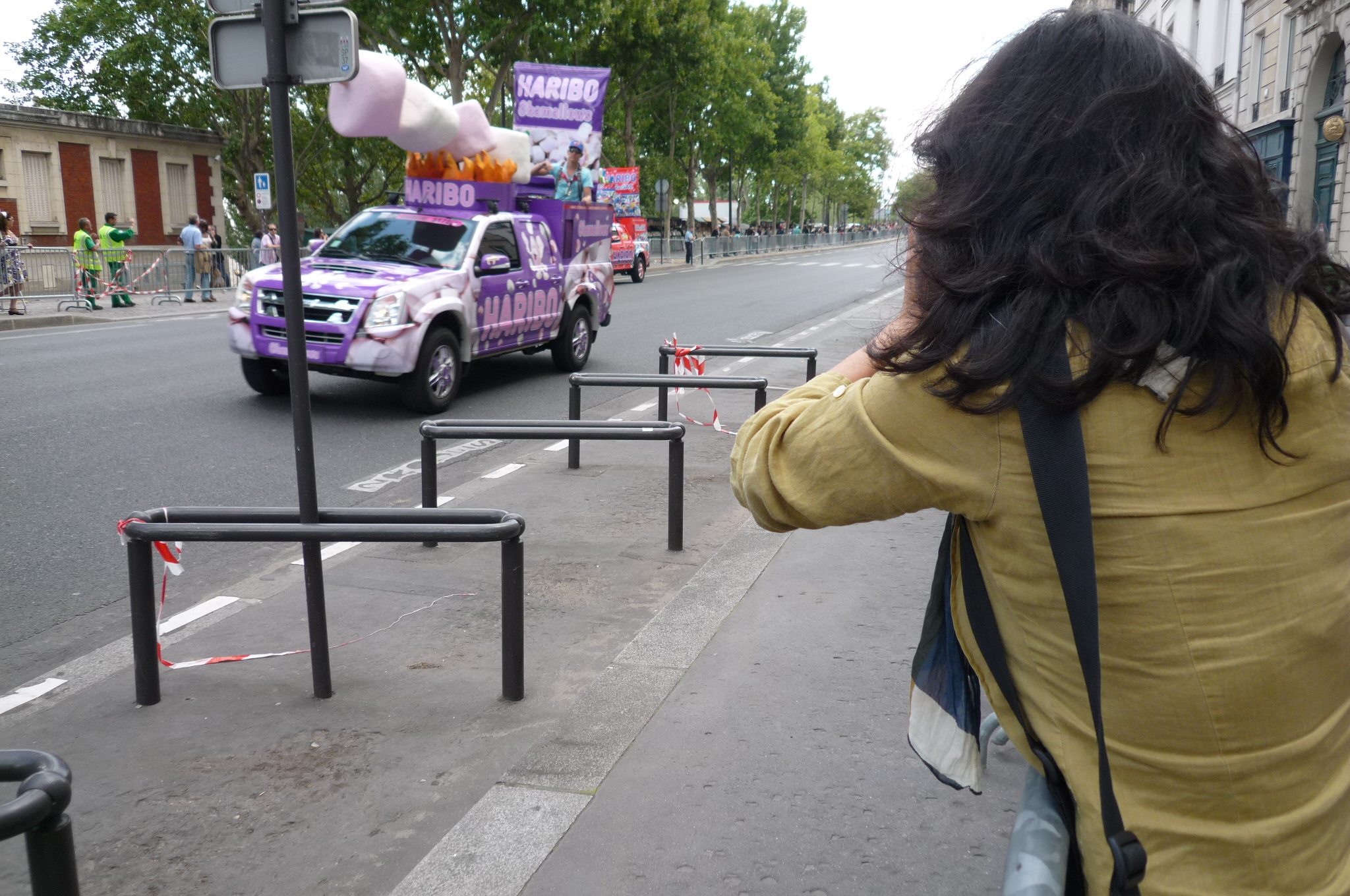 That’s Sarah taking photos, hopefully on sports mode…they were really roaring by us. I suppose it was because they don’t throw stuff when there are barricades, or possibly, after 3 weeks of fake smiles and happy waves, everyone was just in a hurry to get it all over with. Anyway, it meant no saucisson for me on this day.
