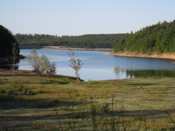 One of the joys of any climb is, of course, the descent.  Descending the Montagne Noire on the D101 is a pleasure in itself.  The first 5 kilometers consist of not-too-steep,  wide-turn country road with views such as this one of a man-made lake.  You can just make out the damn on the far left side.