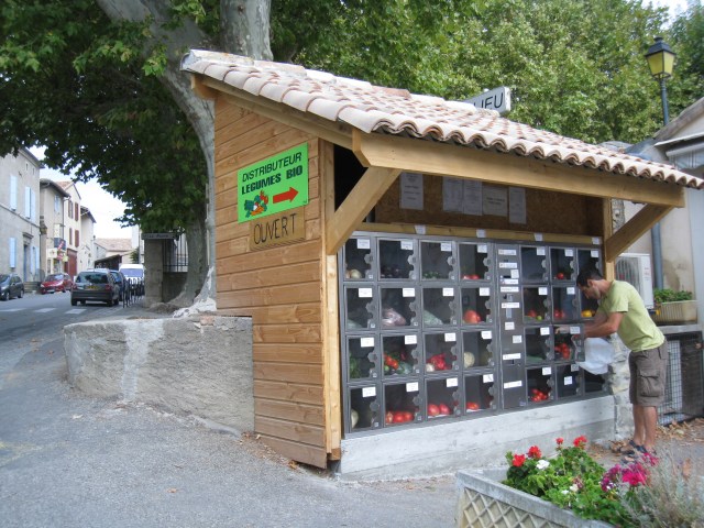 Just in case you don’t fuel up properly at the beginning of the ride, you can always stop at the green grocer in Montolieu for a snack.  The owner is evidently an ecological avant-gardiste, as he/she has installed perhaps the world’s first automatic organic vegetable distributor.  I couldn’t resist taking a photo of it in action!