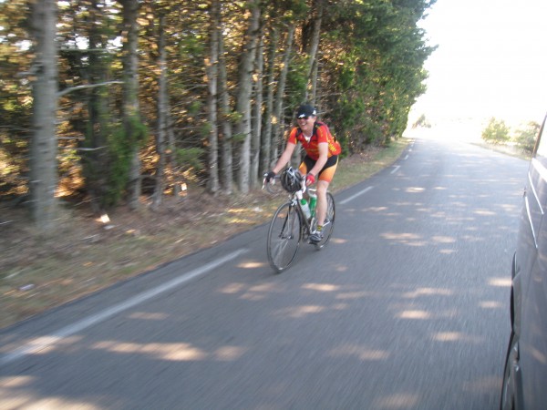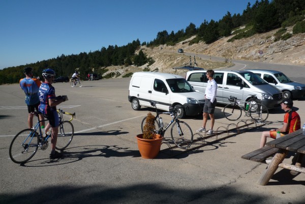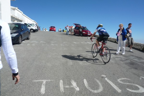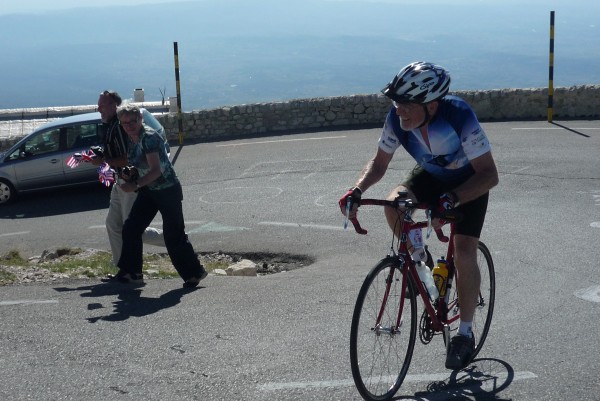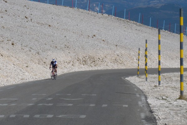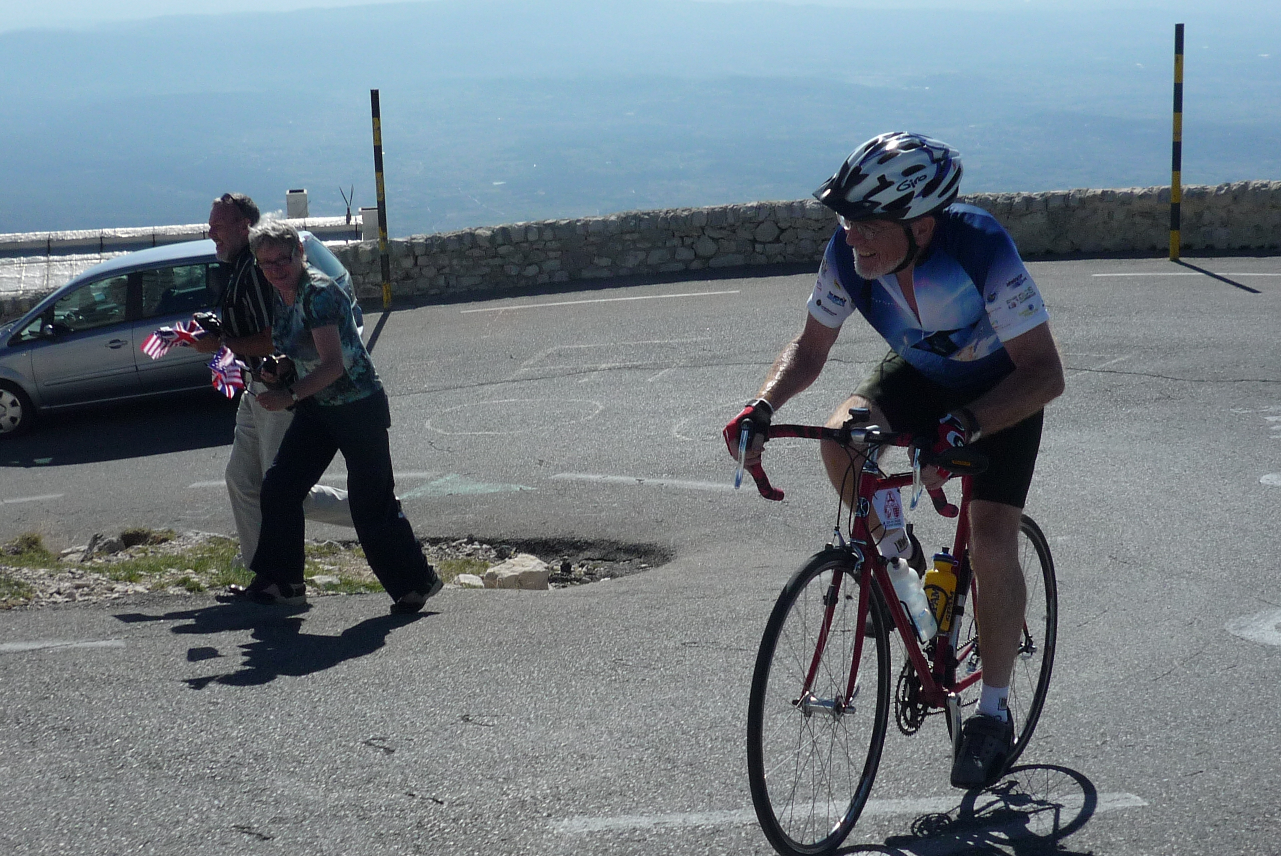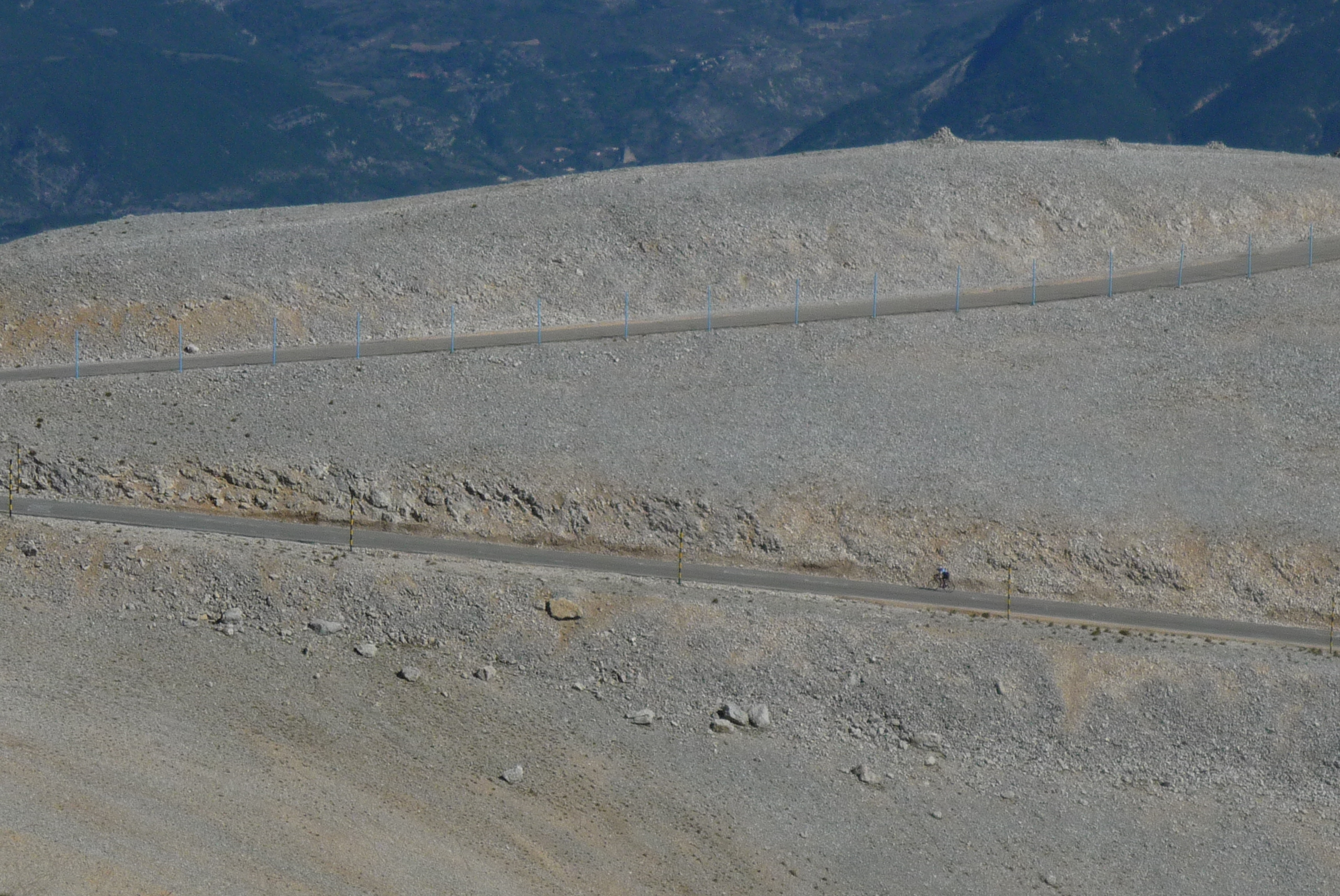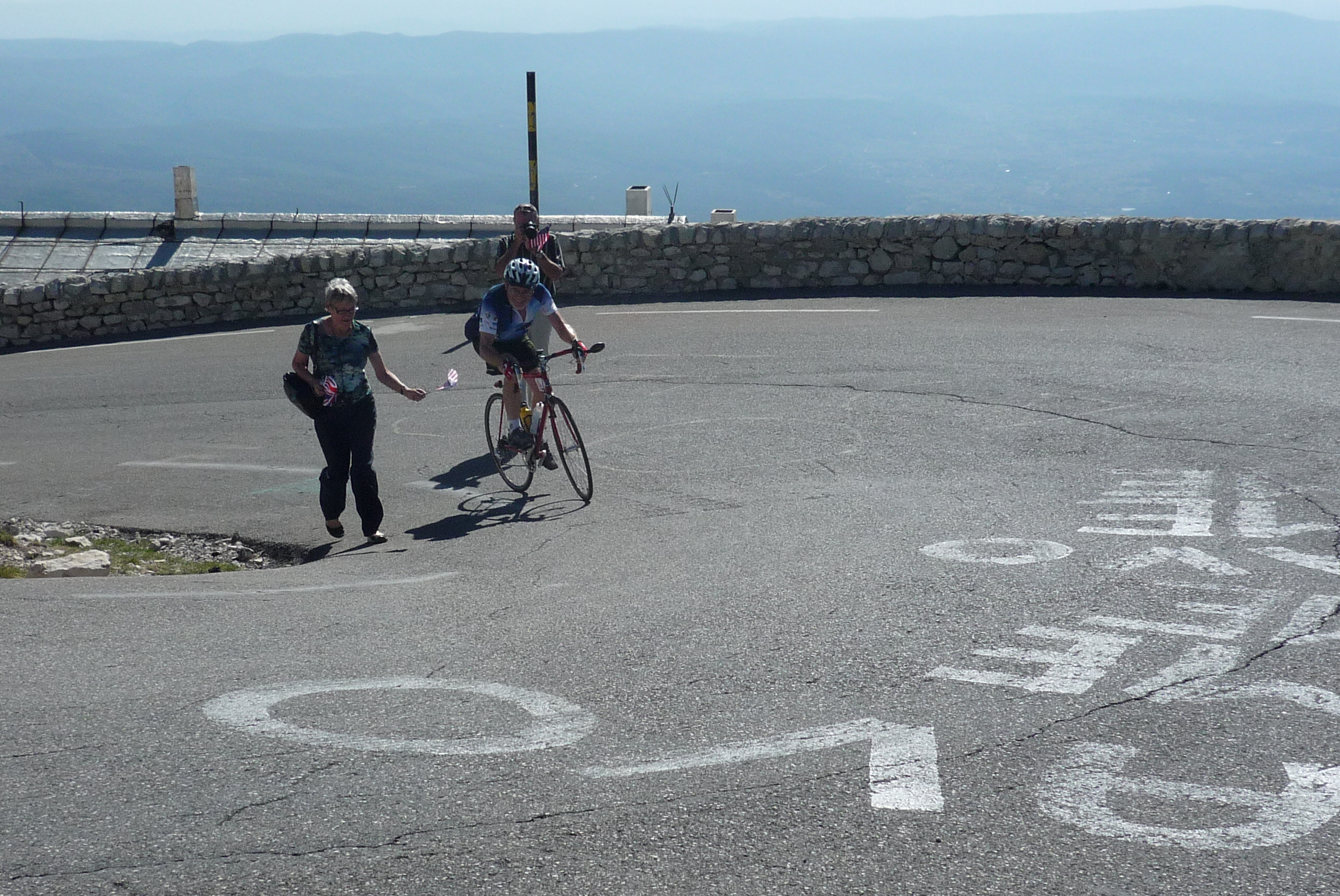 Not to be. They had summited, descended down to Malaucène for lunch and then a 2nd ascent from the north side. With nothing to do but wait, that’s what we did. We spent a really nice afternoon on the top of Ventoux, checking out the Alps to the north and trying to figure out where stuff was in the distance, chatting with Tony’s other support team (wife Audrey, et al), and playing ‘spot Tony’ from the summit. Then, he came into view…sort of.