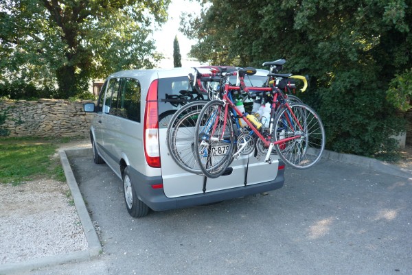 Monday was a simple pick-up from Pont du Gard because the group wanted to stretch their legs by cycling from their hotel in Montpellier over to the acqueduct, a 90-km warm-up for their assault on Mont Ventoux the next day. Here are the wheels I had for the two days; I’m fairly sure the only Benz I’ll ever have the pleasure of driving.