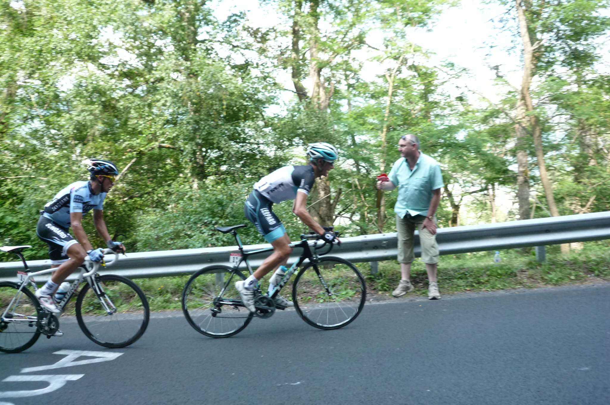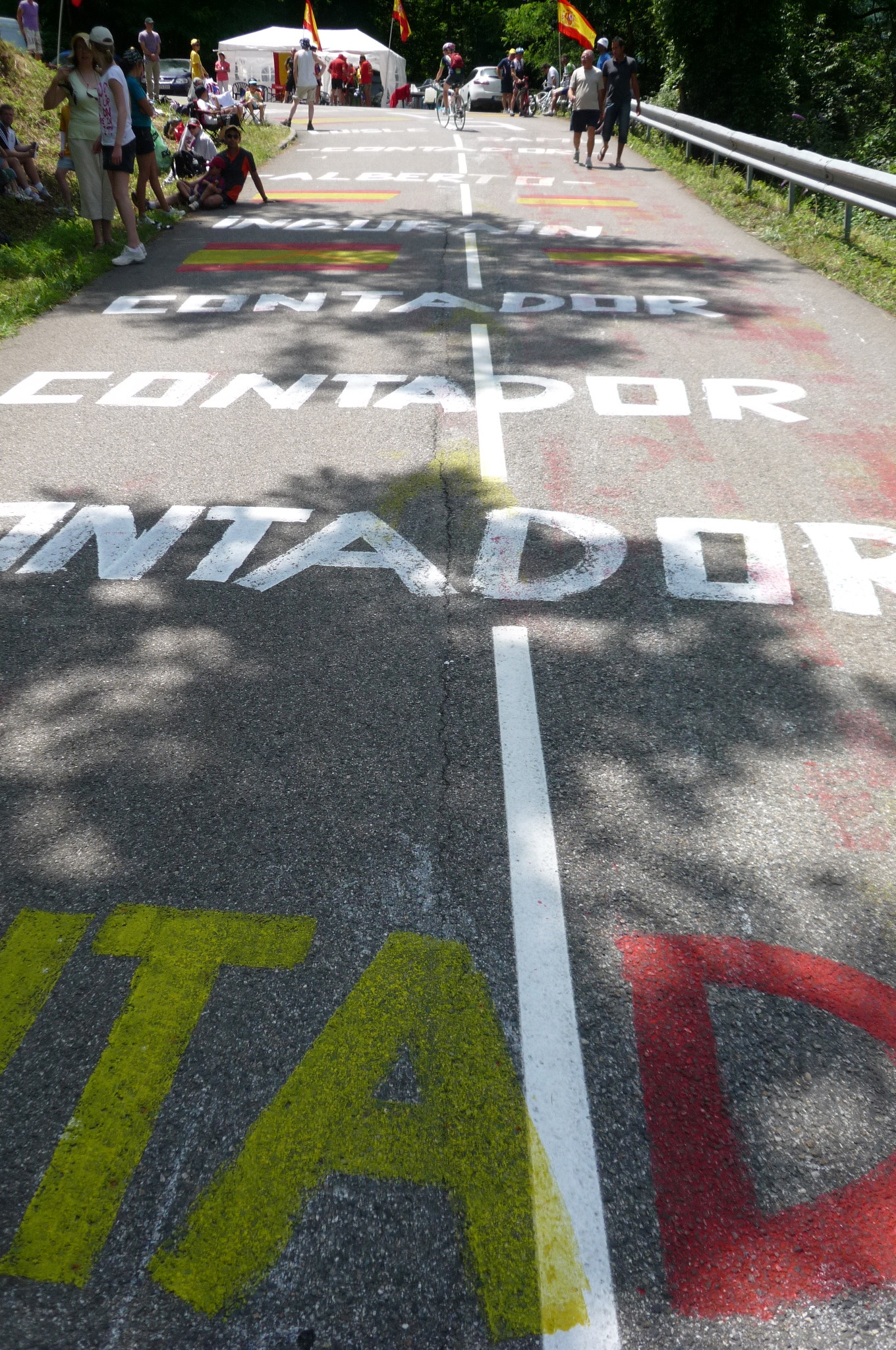 After an hour or so of having crappy hats, fridge magnets and chewing gum thrown at us, the peloton finally arrived. Here is Andy Schleck and Alberto Contador, just before one of them put in an ill-fated attack, I think.