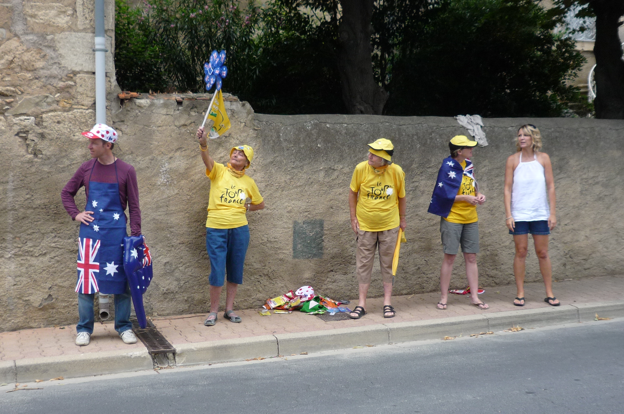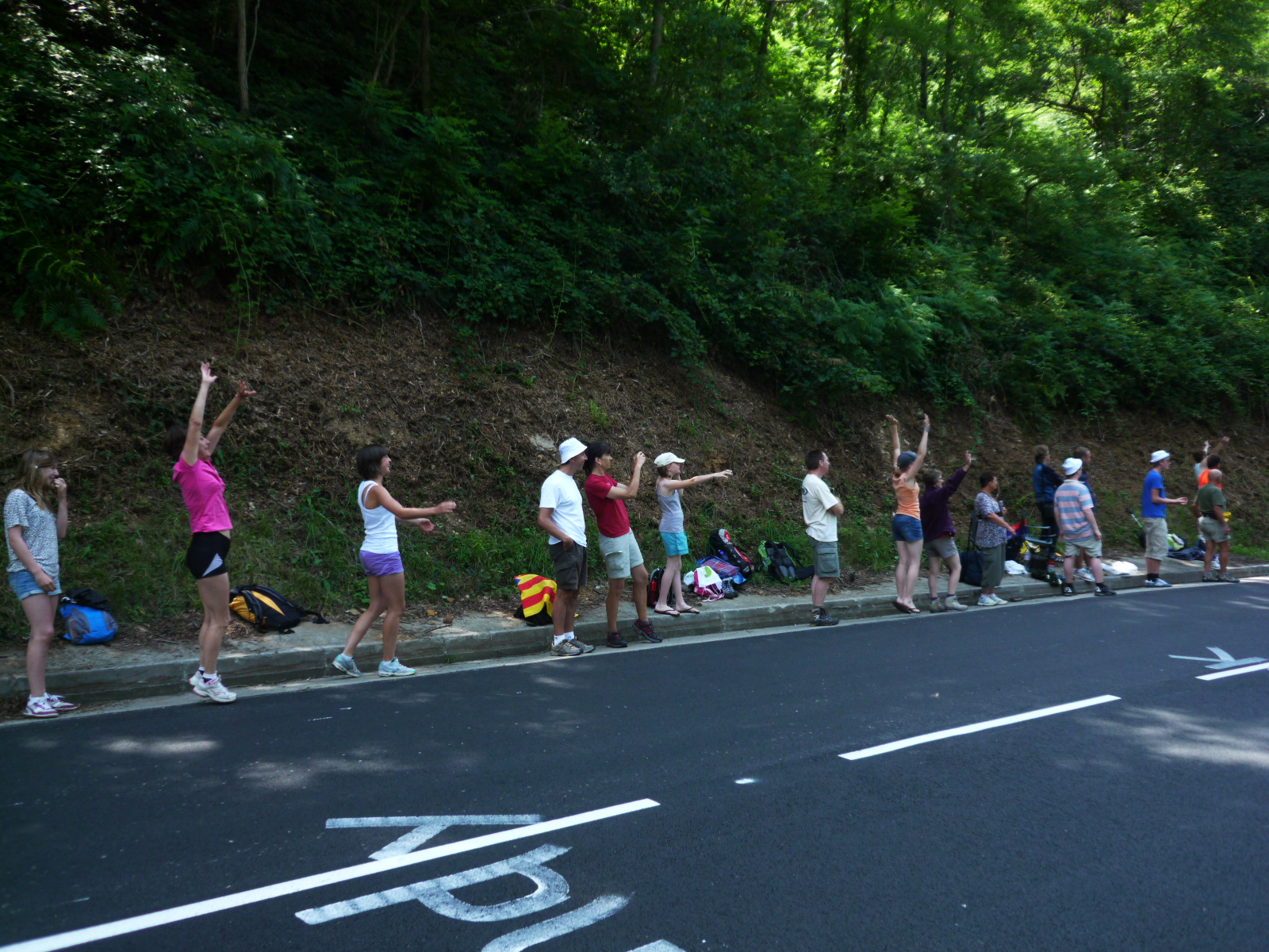You might think these rabid fans are cheering for their favorite rider. Sadly, you’d be wrong. They are trying to get the attention of the junk-throwing people who ride on the floats of the publicity caravan. The family in the foreground went berserk when the saussison guys rolled up.