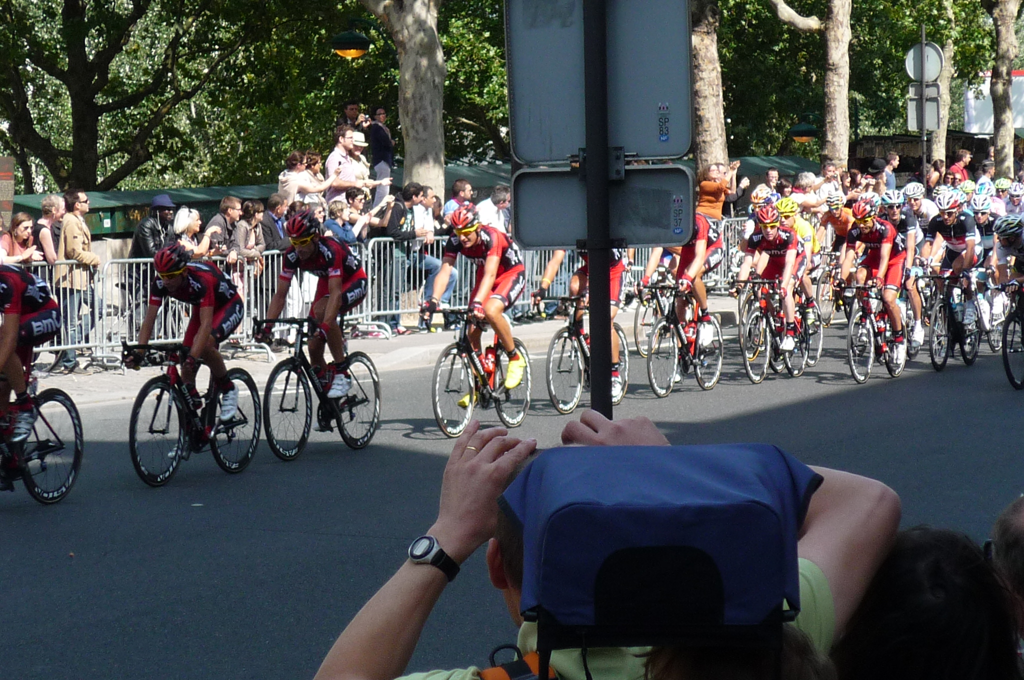 BMC leads the peloton into Paris, with overall winner Cadel Evans (in yellow) hiding at the end.