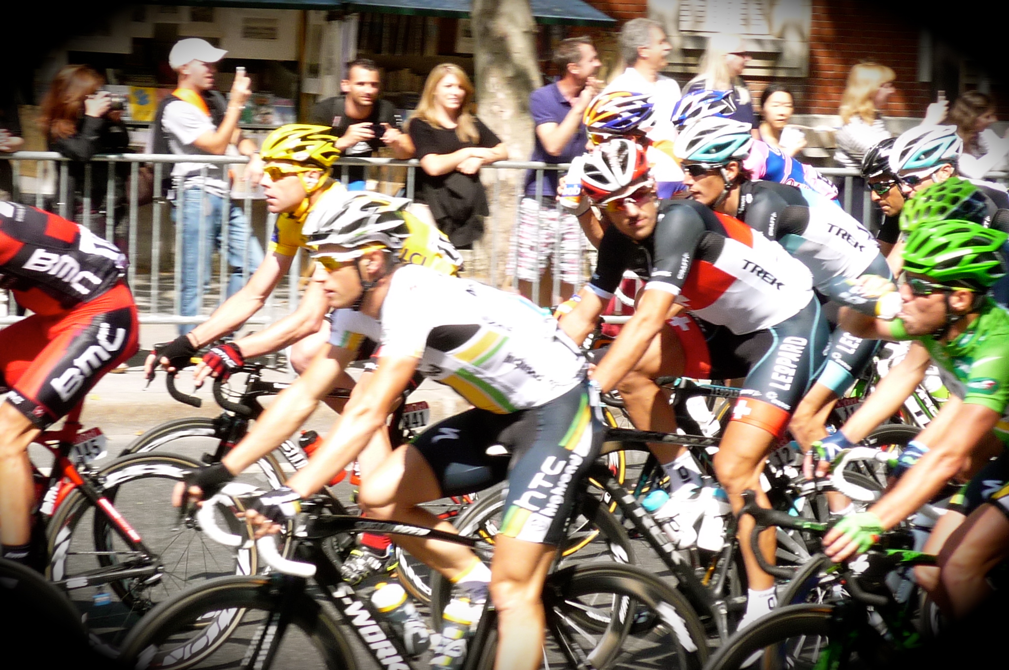 Various big shots bunched together. Cadel Evans, Fabian Cancellara, Andy Scheck and eventual stage winner, Mark Cavendish (in green).