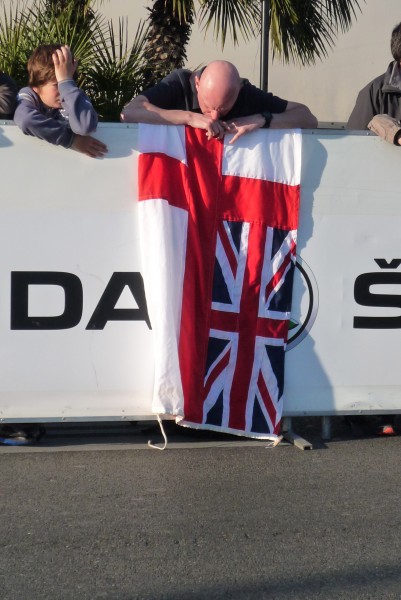 It was not to be, though, since the loud speakers told us that Thomas De Gendt (riding a Bianchi, I’ll have you know) was out in front with an 11 minute lead and that the peloton had given up the ghost long ago. No sprint for the win. But there was a very satisfied Belgian to watch. There must be no better way to win a stage than to have a long, beautiful stretch of road all to yourself, with plenty of time to zip up your jersey, clean your face, figure out which victory sign you’ll be giving this time, then sit up and cross the line in tranquility. He seemed satisfied with it, anyway.
