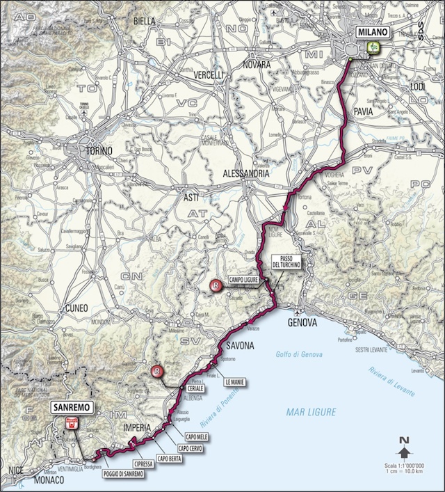 Shoko and I have made our spring trip east this year, so we won’t be going to see Milan-San Remo this time around, I’m afraid. But hey, bike races are better on TV anyway (as always, check Steephill.tv for live listings). This year’s route is just like last year’s, and the year before, etc., etc., but here it is anyway.