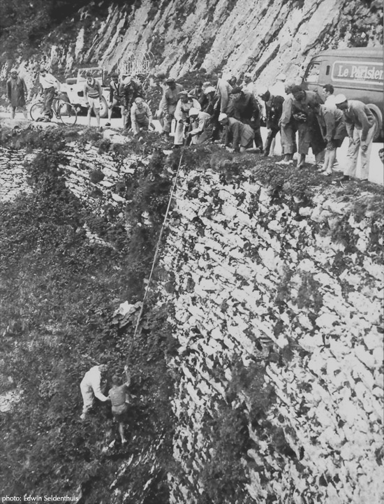 Probably the most famous (or infamous) event that occurred on the Aubisque was the awesome spill that Yellow Jersey wearer Wim Van Est took off a cliff on the descent in 1951. Van Est took a turn bad and wiped out, getting chucked off the mountain and falling 70 meters in the process. He survived, but had to be famously hauled up using 40 team tires that were tied together! Ah…the good ol’ days.