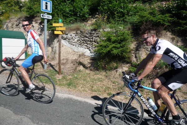 The big climb of the day, the Col de la Lusette, was long, so we threw caution to the wind and took off our helmets. They look like they’re doing something wrong, don’t they?