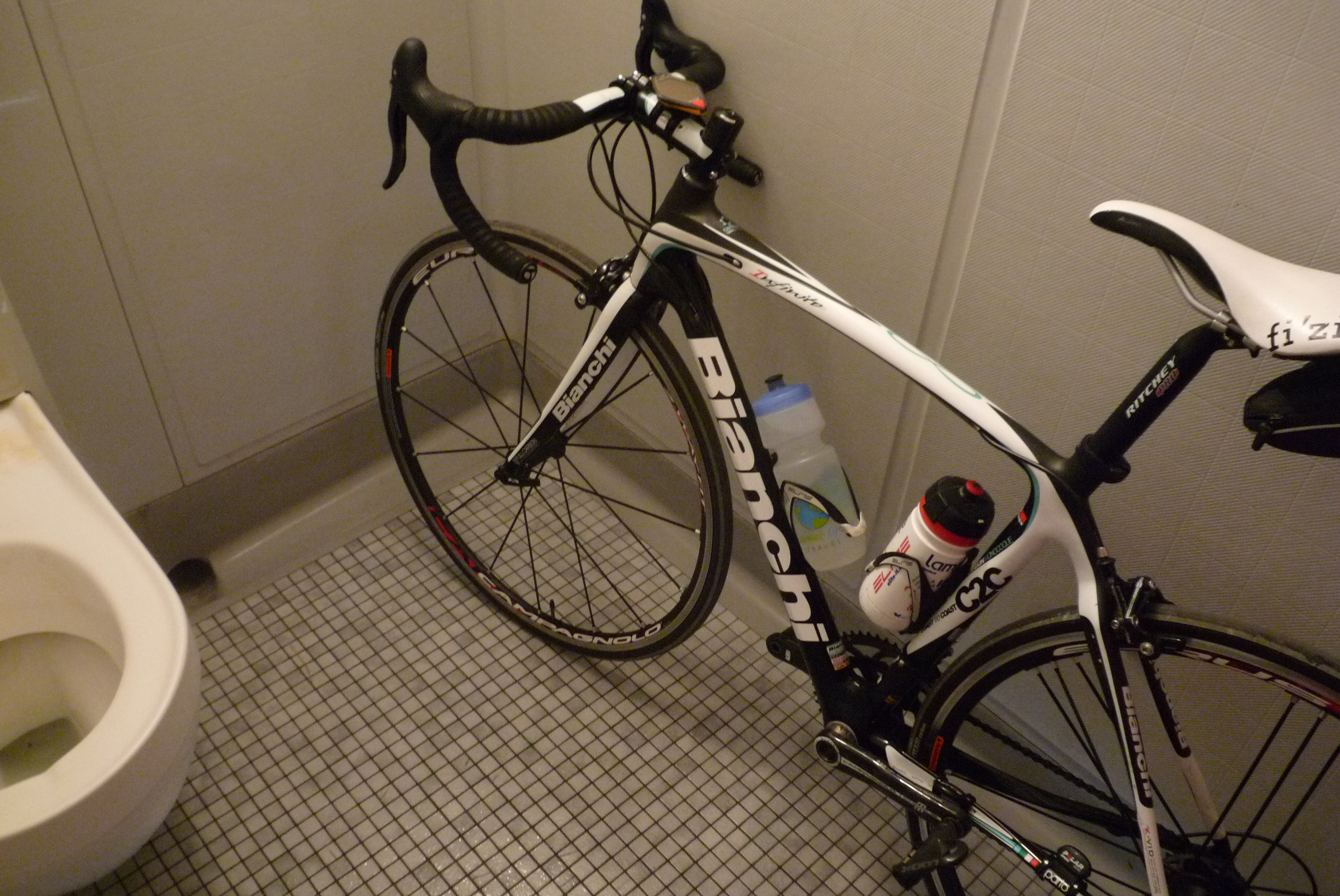 Here’s where it started, in the most bike-friendly public toilet I’ve ever seen!