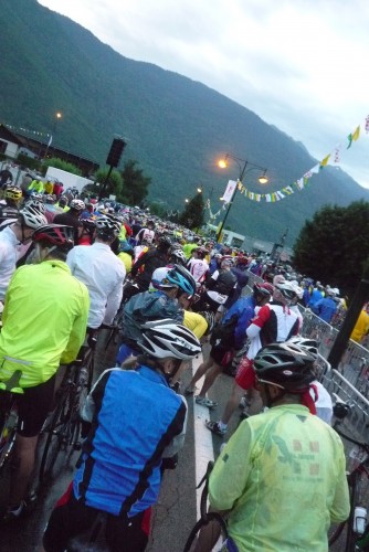 Predictably, after an amazing Saturday of sunshine and dead calm, Sunday began with gusting winds and rain. I’m not sure how many fair-weather cyclists jammed on the whole event because of this, but nearly 9000 registered and only 5700 or so started! Maybe they missed their alarms. Here’s the view from SAS #3.