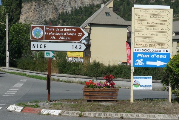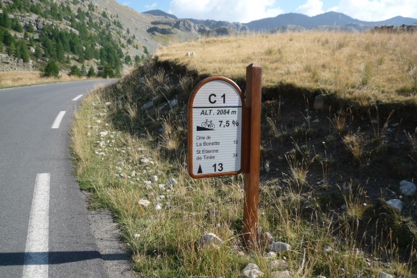 I’ll get back to oddly-named Barcelonnette in another post, but first to a little climbing. Late on Friday afternoon, after a 4-hour ride from home (how lucky am I!), we decided to attack the Col de la Bonette, the highest paved through-road in Europe, as you can see for yourself from the sign (or not, as you may find out soon).