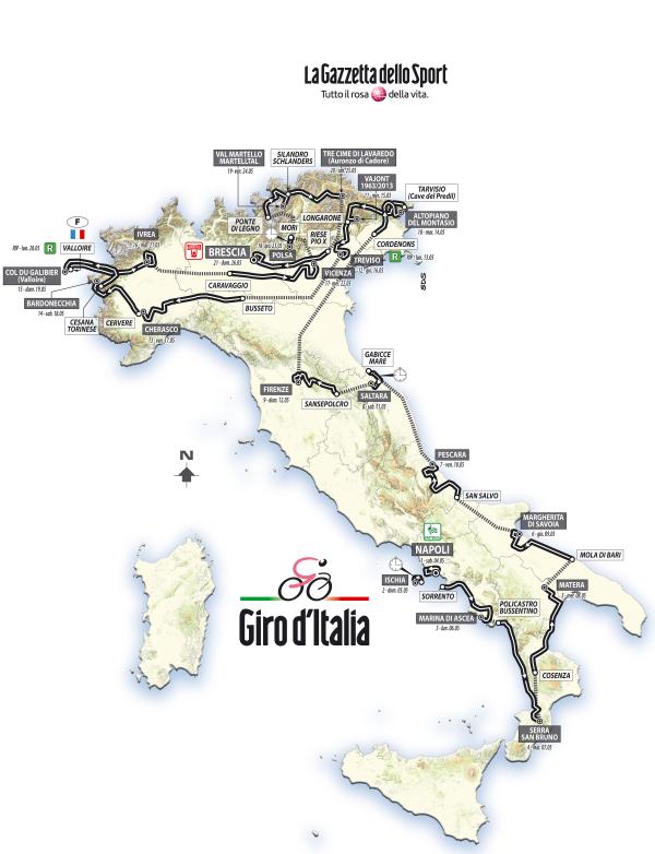 The Giro d’Italia route for 2013 is more balanced than this year’s summit-fest of climbing, with 89 km of time trials, but it still manages to have 7 mountain finishes! The Giro will stay in Italy most of the time next year, with just two days venturing over the border into France, with its first-ever summit finish on the Col du Galibier.