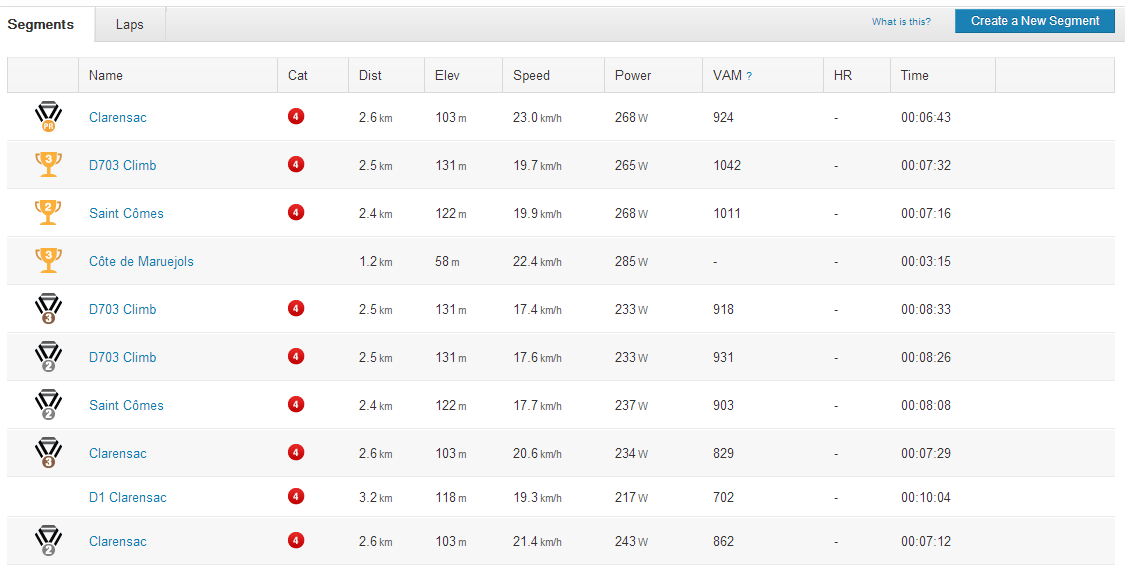 Apart from trophies, Strava hands out ‘medals’ as well, which I think is your own personal Leader Board. On this particular Segment list it all looks like a bit of overkill – I mean, it was just a friggin’ ride in the Vaunage – but I can see the benefit of comparing these climbs with previous efforts, more than comparisons with other riders, actually.