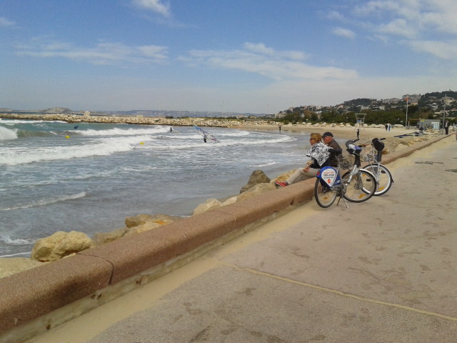A couple of locals along La Corniche, taking advantage of Marseille’s bike share program – Le Vélo.