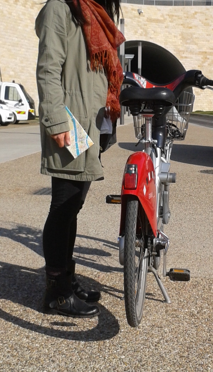 Here’s part of Shoko outside the far-side entrance of Le Tube, right by the conveniently-located Velo’V station. Warning: if you think you can just walk up and rent a bike with Lyon’s system you will be décu; you need to buy a subscription online beforehand. Still, it’s only €1.50 for a day, so well worth the few minutes it’ll take.