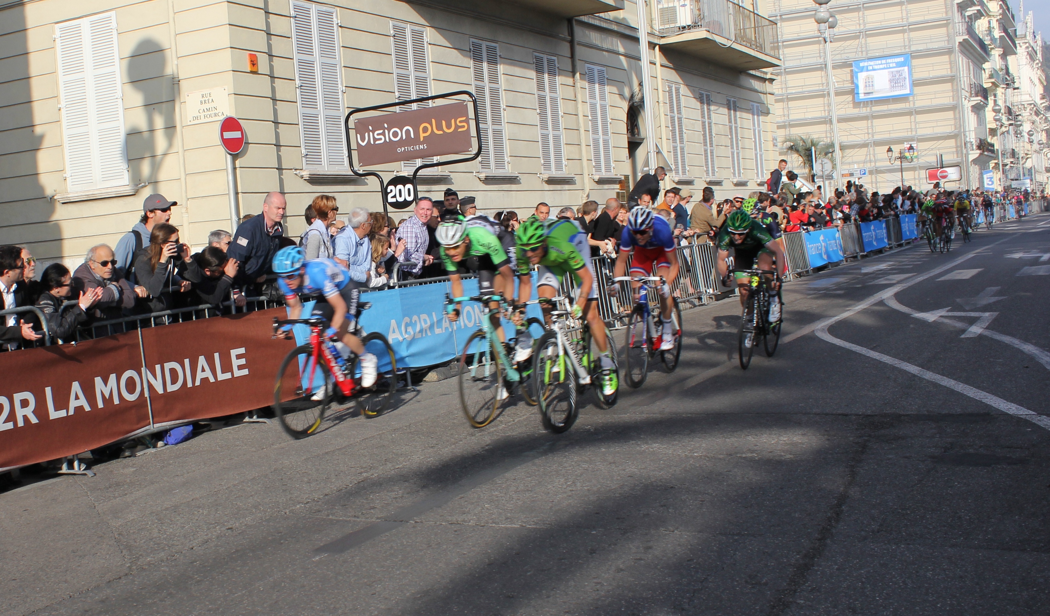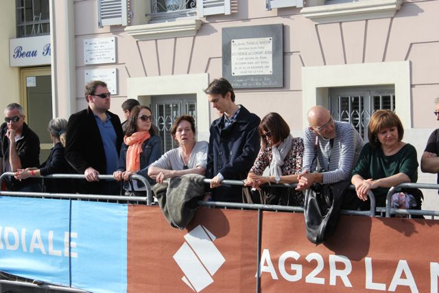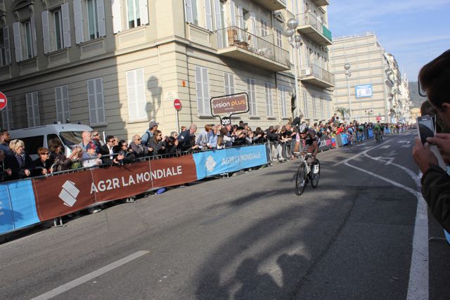 Frank ‘skin-and-bones’ Schleck made a valiant escape on Col d’Eze, I believe, only to be caught at the line by French Champion Arthur Vichot, pictured not very well in the small group behind.