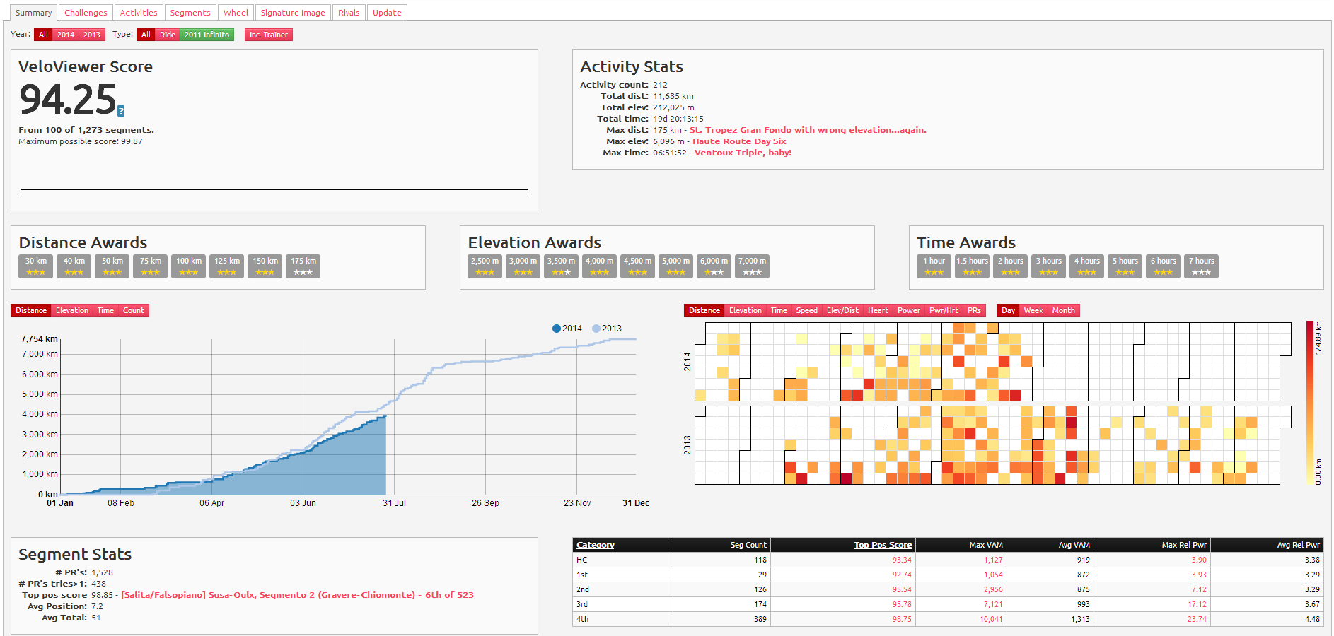 I’m not really a stats freak, but I can appreciate them, especially when they are made into something accessible, visual, and free. Apparently there is a man in the UK who has plenty of time on his hands (as well as plenty of skill) and he has put together a pretty cool site that links to your Strava account and produces stuff like this: