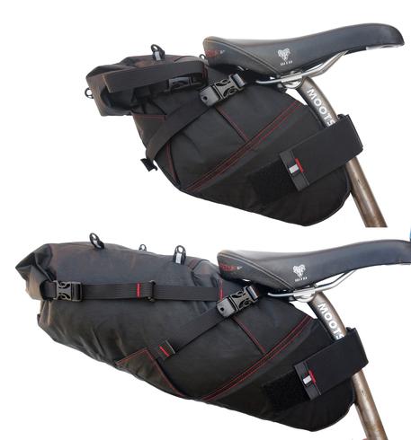 Ultimately goofy looking, maybe, but this sucker (Revelate Designs ‘Viscacha’) fits my shoes, 2 pairs of socks, rain jacket, long-sleeve wool jersey, shorts, 2 t-shirts, underwear, toiletry kit, extra tube, and a few other things I can’t remember right now. 14 litres, so they say. I haven’t tested it out yet, but I’ve packed it and I can see that it’ll sway from side to side a bit. There’s not too much climbing on my route, so I don’t think that’ll be an issue.