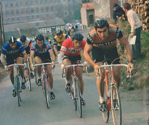 Patrick Sercu, a rider for the Brooklyn team, recounts a little tale that happened in the early 70s. Sercu was driving from Ghent to Liège with his dad because his team had called him in at the last moment to race La Doyenne. It was blowing and snowing on the road from Brussels to Liège. Suddenly, they saw a cyclist up ahead. They both wondered out loud who’d be nuts enough to be out on the main road in these conditions. Of course it was Eddy Merckx. Apparently, he was riding the 100 kilometers from Brussels alone because he hadn’t won Flèche Wallonne a couple of days earlier. He won L-B-L the next day, 5 minutes ahead of the next rider.